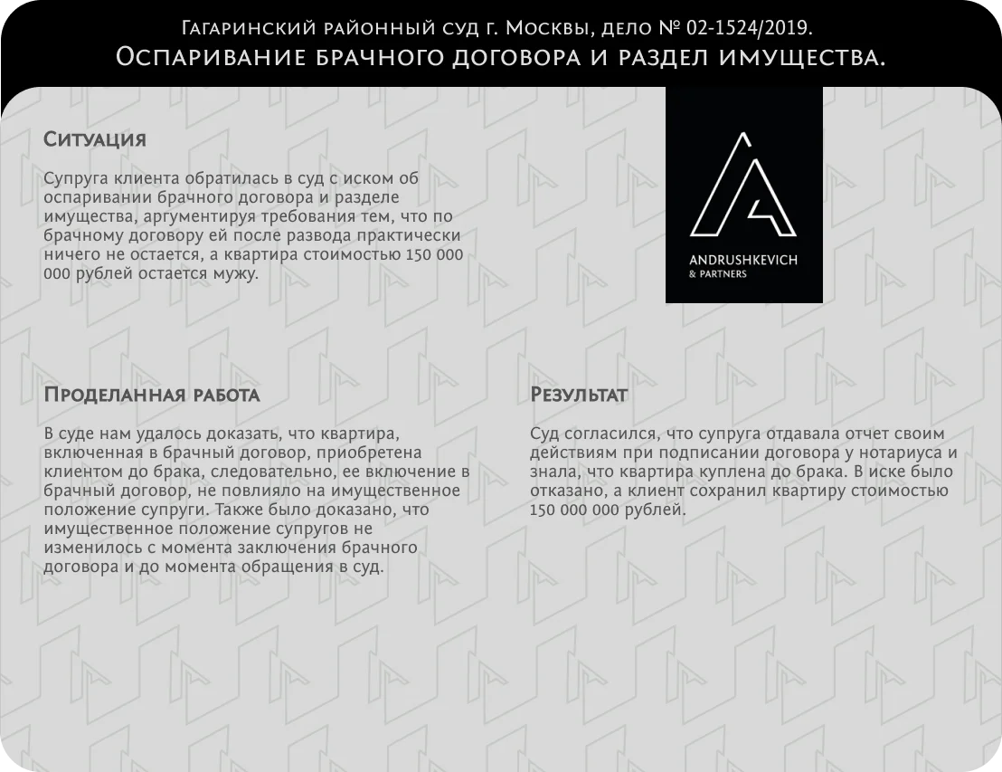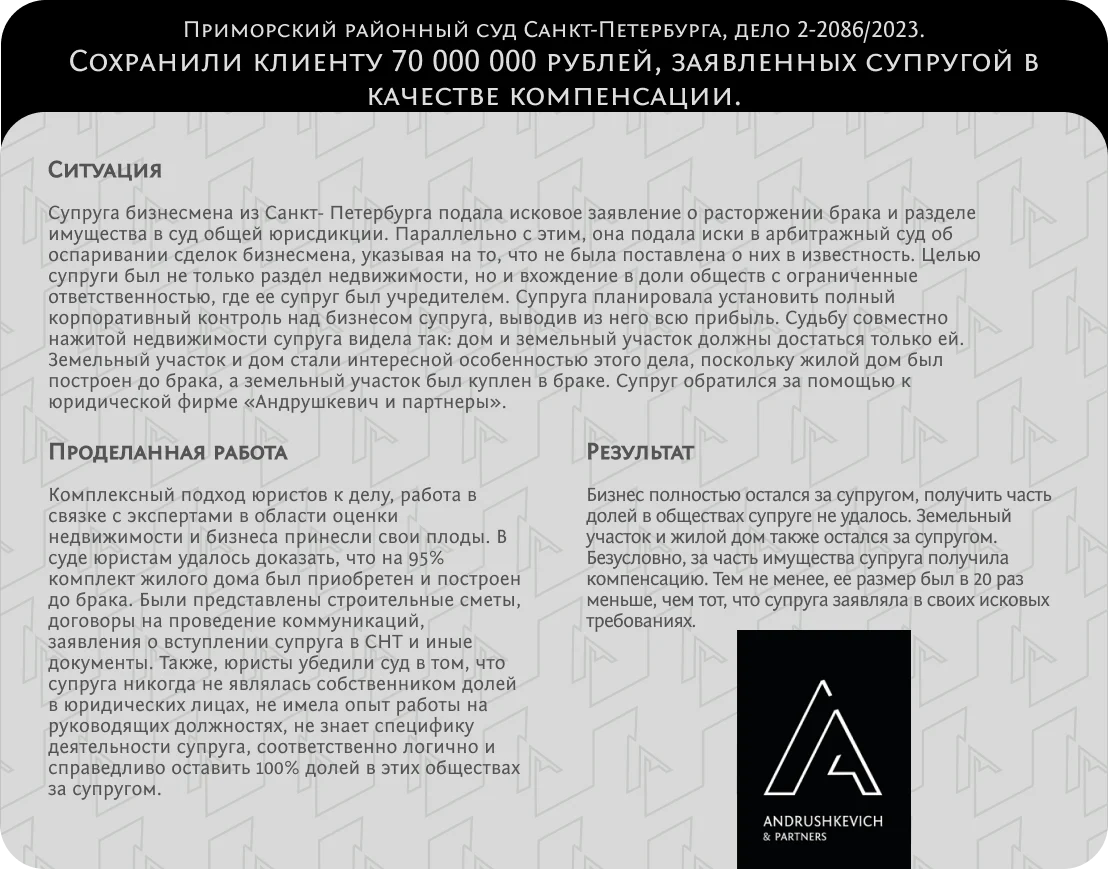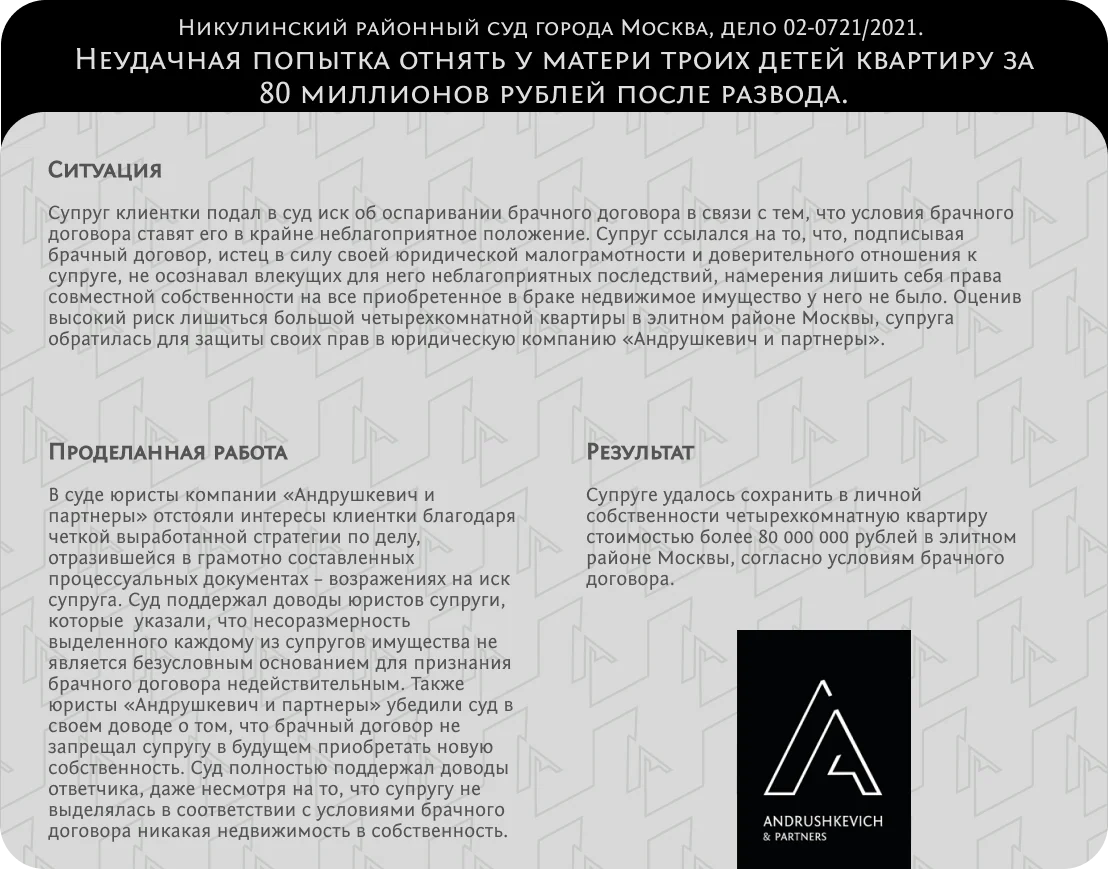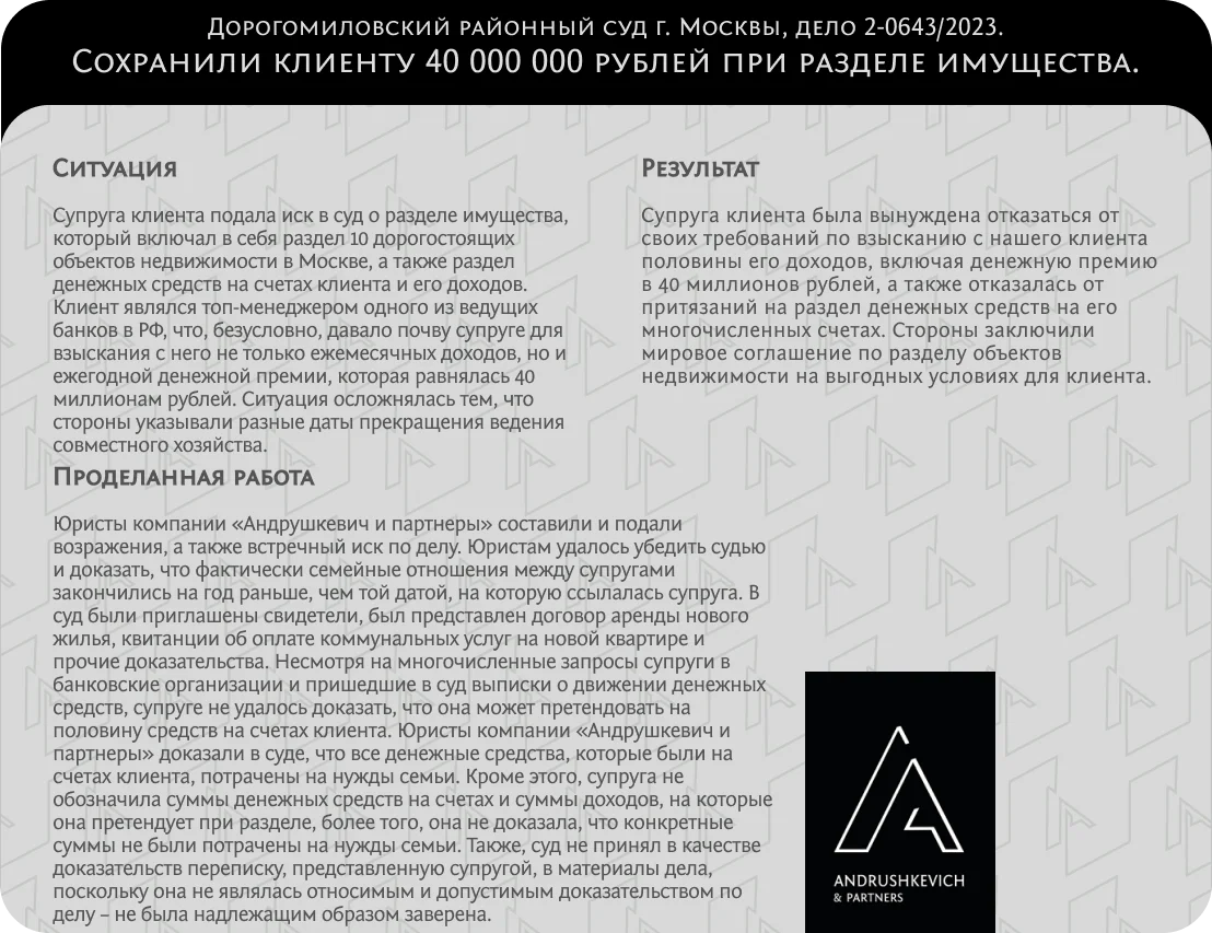 Поможем сохранить совместное имущество, сберечь средства при разводе и честно решить дела.